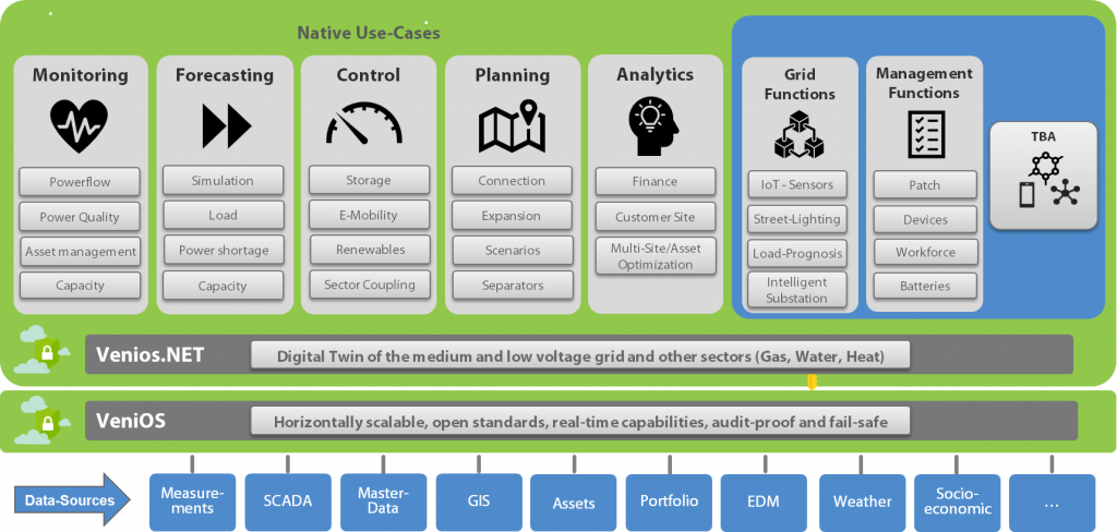 The Venios.NET platform supports many different use cases on top of a unified interface, consolidating the various systems at infrastructure operators.
